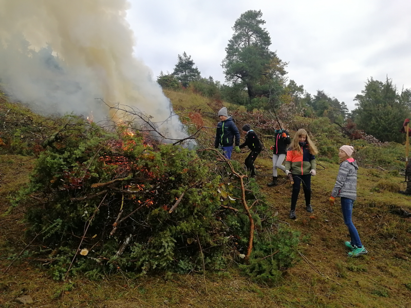 Am Dienstag, den 13. Oktober 2020 waren die 7. Klässler*innen des Progymnasiums auf der Wacholderheide am Nähberg aktiv. Nachdem uns Herr Stocker den Zweck der Landschaftspflege (und wie man diese durchführt) erklärte, fingen die Schüler*innen an, dieses Naturschutzgebiet zu pflegen. Sie lernten dabei, wie sich bestimmte Pflanzen (z.B. die Silberdistel und der Enzian) an die Umwelt anpassen und welche Tierarten (z.B. seltene Schmetterlinge) von dem Aussterben bedroht sind. Mit Handschuhen und Rechen trugen die Schüler*innen die kleinen und großen Äste ans Feuer und verbrannten sie. Dies war trotz Feuchtigkeit kein Problem, da ein großes, prasselndes Feuer „wie ein Kamin“ funktioniert und Gehölz in sekundenschnelle trocknet. Der Tag begann um 08.30 Uhr, hatte zwischenzeitlich eine Vesperpause und endete um 12.00 Uhr nach der Rückfahrt mit dem Bus. Nach einem arbeitsreichen aber ebenso lehrreichen Tag gingen die 7. Klässler*innen dann erschöpft nach Hause.